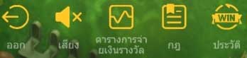 ปุ่มกดออกเพื่อเข้าสู่หน้าเกมส์หลัก  ปุ่มปิด/เปิดเสียง ปุ่มที่บอกตารางการจ่ายเงิน ปุ่มกติกาการเล่น และปุ่มประวัติการเล่นตามลำดับจากซ้ายไปขาว